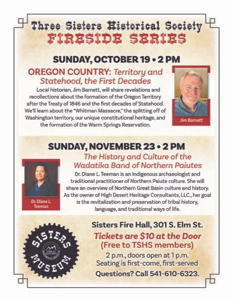 Reservations may be made at 541-610-6323. Doors will open at 6:00. Tickets are $10 and will be available at the door. Seating is first-come, first-served. The event is free for current members of the Three Sisters Historical Society, and you will have the opportunity to join TSHS at the event!